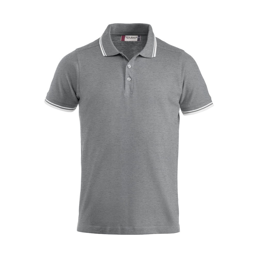100% gekämmte Baumwolle (graumelliert 85%Baumwolle, 15% Viskose). 190 g/m2. Polo mit Kontraststreifen am Kragen und Ärmelbündchen. Seitenschlitze.