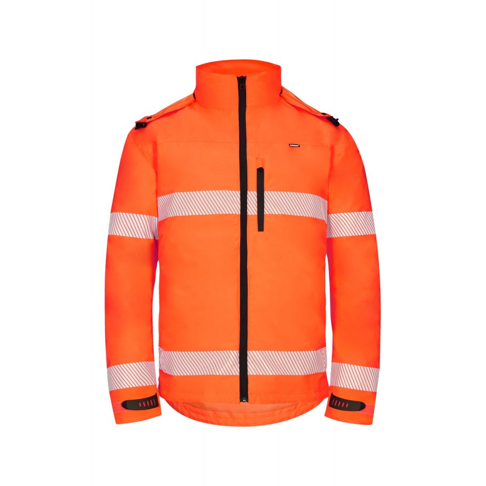 Super leichte, sportliche und moderne Warnschutzregenjacke geprüft nach EN20471 Klasse 2 und EN343-3-3. Verlängerte Rückenpartie. Abnehmbare Kapuze. Wasserdichte Reissverschlüsse.