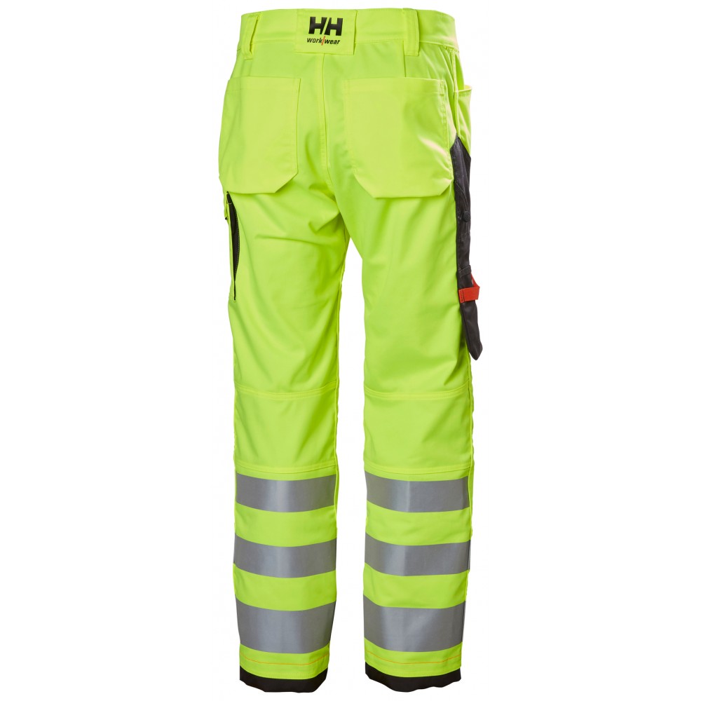 Warnschutz Bundhose Klasse 2. 83% Polyester, 14% Baumwolle, 3% Elasthan. EN ISO 20471:2013 Klasse 2. 2-Wege-Stretch. Metallknöpfe mit Kunststoffbeschichtung. Von innen zugängliche Kniepolstertaschen.