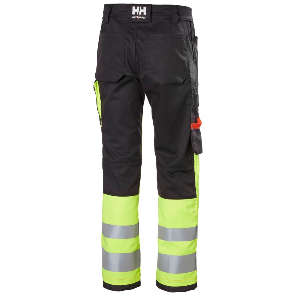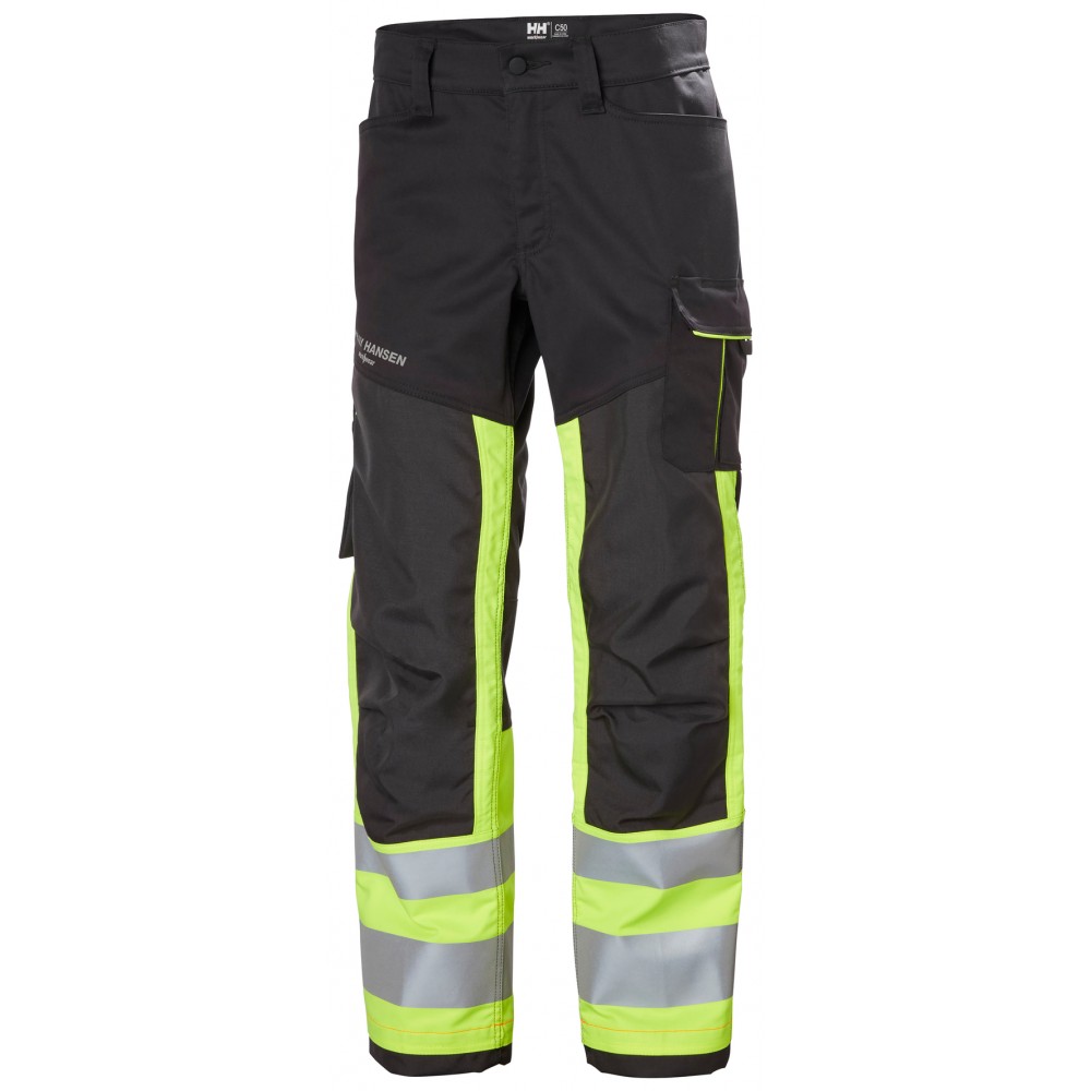 Warnschutz Bundhose Klasse 1. 83% Polyester, 14% Baumwolle, 3% Elasthan. EN ISO 20471:2013 Klasse 1. 2-Wege-Stretch. Metallknöpfe mit Kunststoffbeschichtung. Von innen zugängliche Kniepolstertaschen.